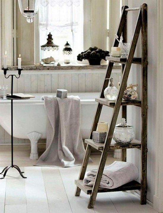 Популярное в последние годы стильное украшение ванной – полки в виде лестницы. Старую деревянную лестницу можно отделать в стиле декупаж.