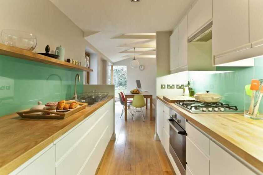 Этот прием идеально подойдет для кухни-гостиной, когда акцентировать внимание нужно на гостиной, а не на рабочем пространстве кухни. В этом случае отделать фартук лучше не плиткой, а, скажем, стеклянной панелью или покрасить стену в этой области специальной влагостойкой краской