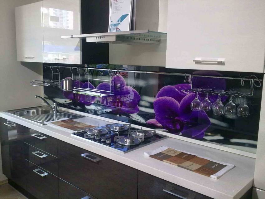 - Оргстекло – точнее говоря, панели из акрила и поликарбоната. Фотопечать на них обладает теми же достоинствами, а вот сам материал несколько отличается. Превосходя силикатное стекло по прочности и безопасности, пластик проявляет склонность к деформации при нагреве. Такой вариант рекомендуется для кухонь с электрической плитой либо индукционной варочной поверхностью. На фото ниже – акриловые панели с фотопечатью на кухне.