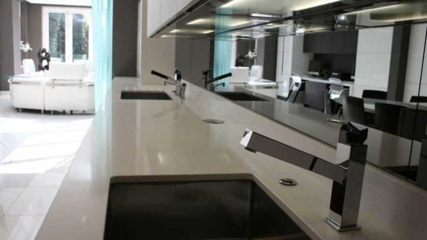 - На дорогих столешницах из искусственного камня, мрамора или гранита устанавливают бордюры из того же материала. Их изготавливают на заказ вместе со столешницей.