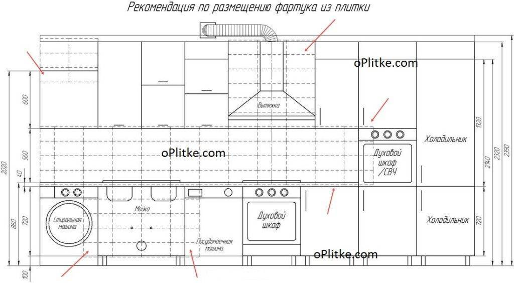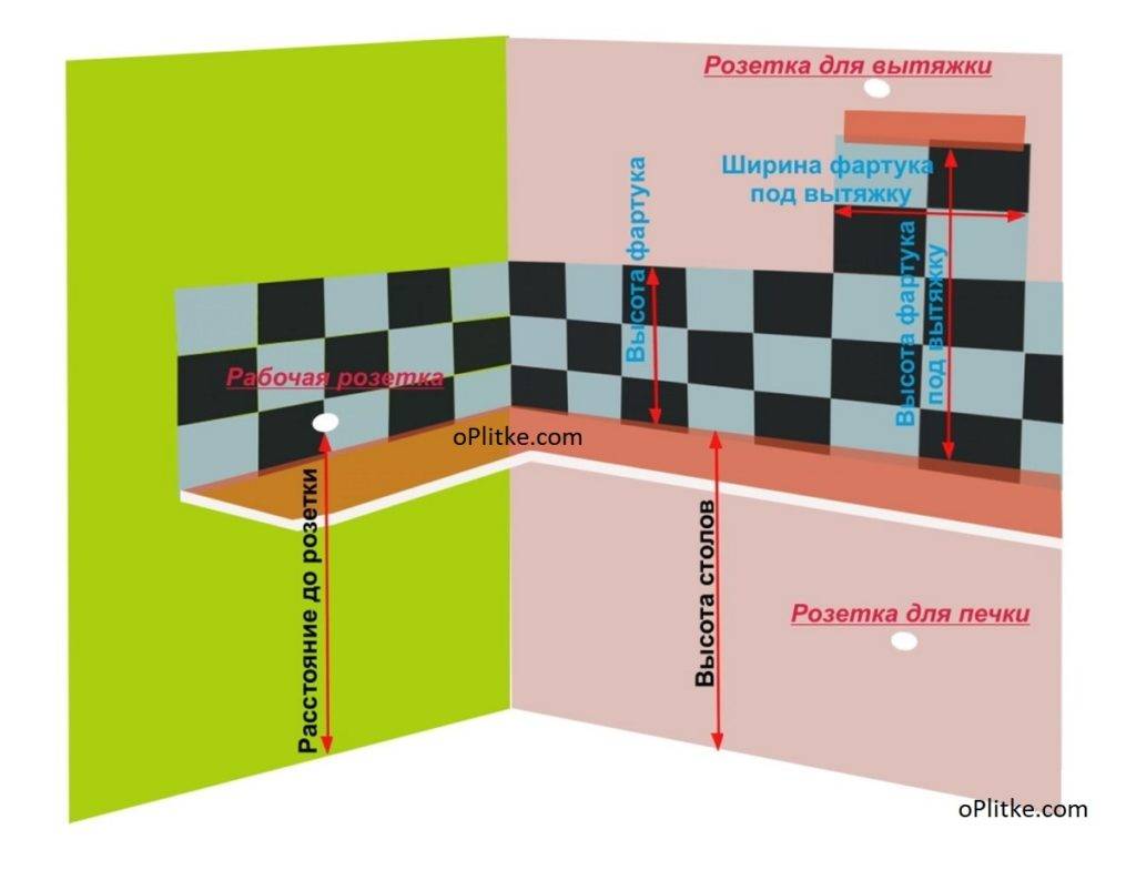 В ширину фартук может иметь любой размер. По правилам эргономики пространство в кухне должно быть организовано удобно для жильцов дома. При этом должен соблюдаться рабочий треугольник: холодильник (достать продукты) — мойка (помыть) — плита (приготовление пищи).