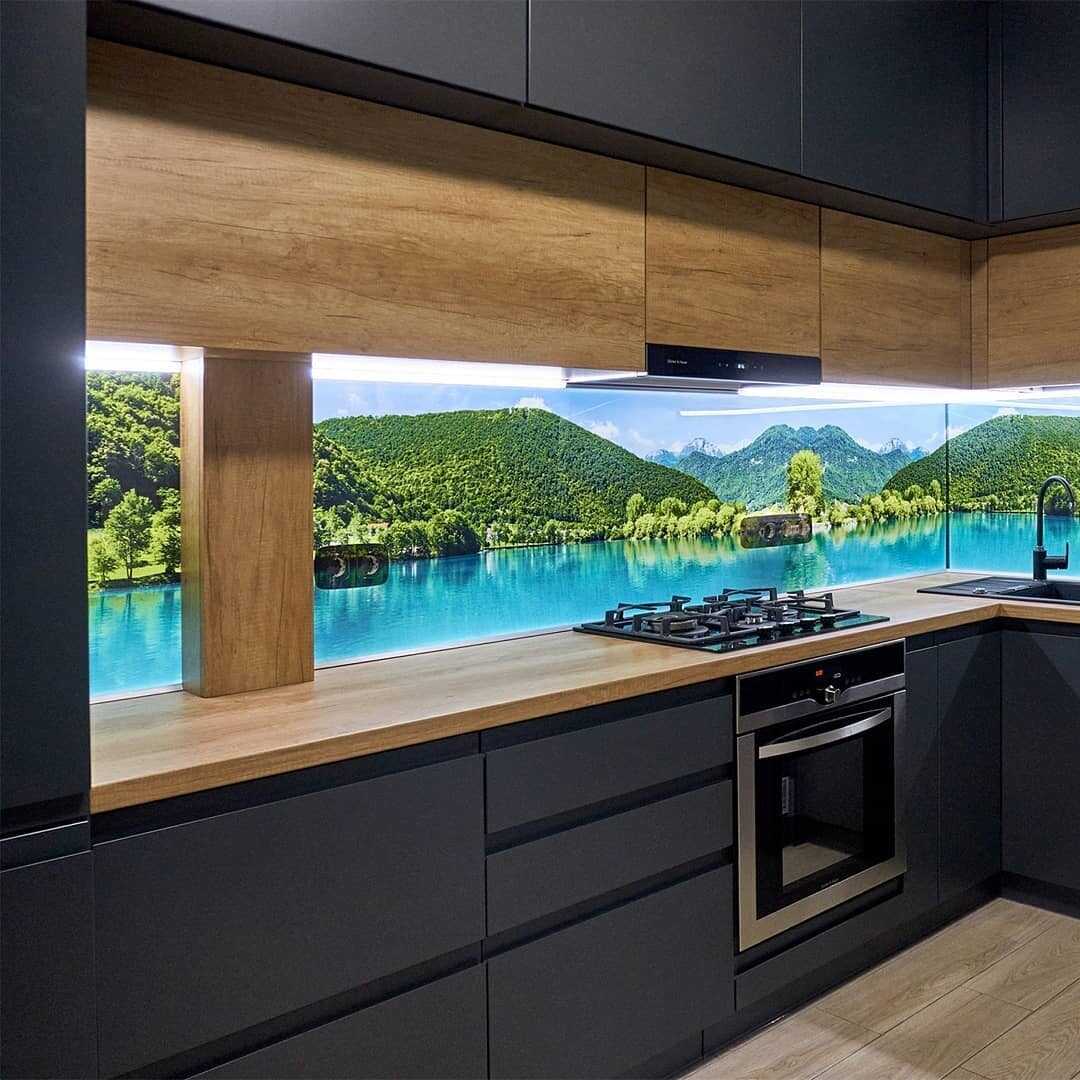 Стеклянные фартуки вопреки мнению об их хрупкости и ломкости довольно практичны. Закалённое стекло выдерживает высокие температуры. Если оно имеет гладкую поверхность, то моется легко. Стекло может быть матовым и прозрачным, с рисунком и без него. Прозрачную защиту на стену можно закрепить таким образом, чтобы она легко снималась, и тогда кухню можно разнообразить, меняя узоры под ней. Там можно поместить фотографии и рисунки, которые могут по-разному выглядеть благодаря разнообразной светодиодной подсветке. Такие фартуки очень красивы, влагостойки, но всё-таки могут разбиться.