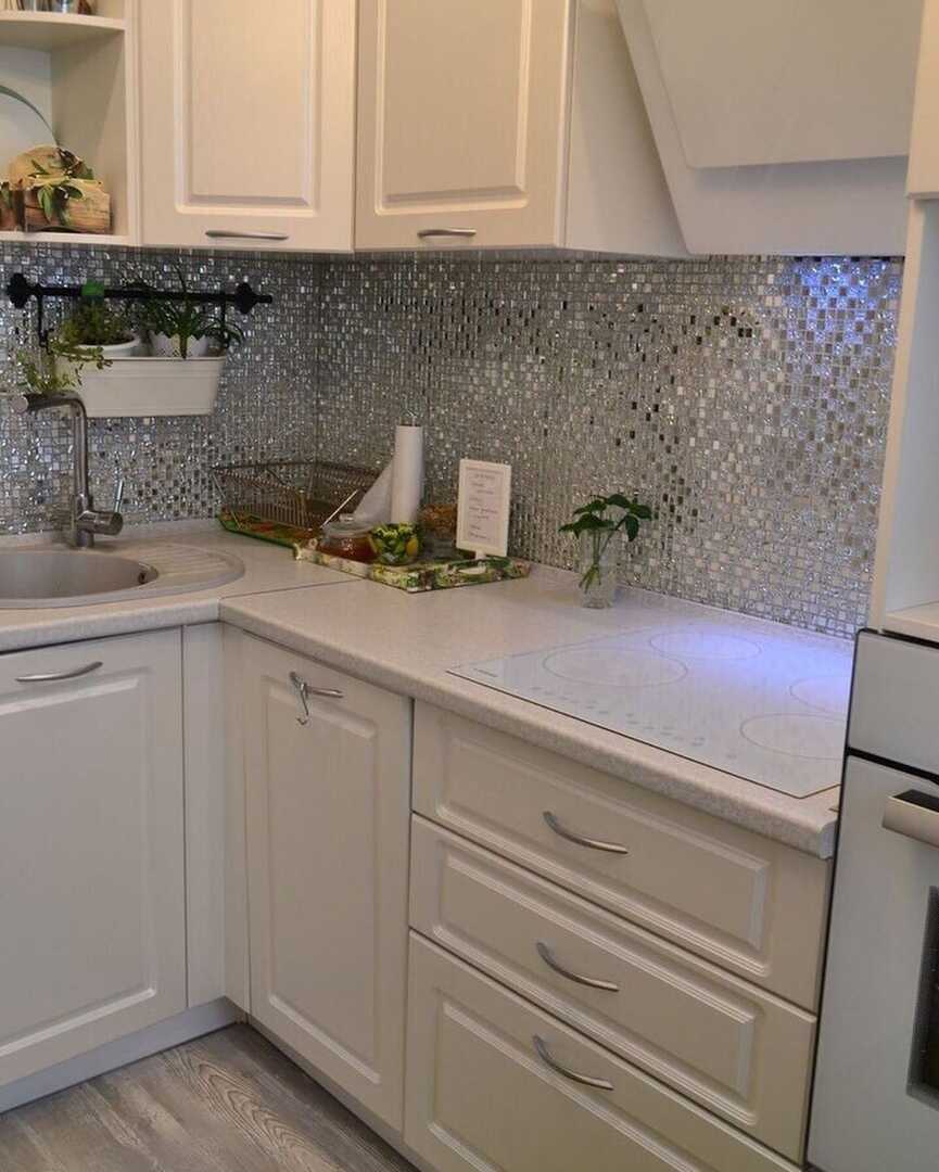 - Увеличить пространство и усилить освещение кухни поможет и зеркальный фартук. Правда, подойдет он лишь для тех, кто редко готовит и делает ставку на красивый внешний вид, ведь зеркало очень сложно поддерживать в чистоте.