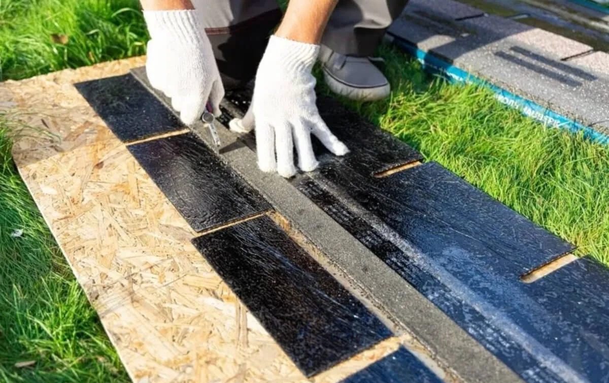 Для изготовления стартовой полосы лепестки гибкой фасадной плитки отрезают ножом на ровном твердом основании. Таким образом, остается полоса плитки высотой 15,3 см.