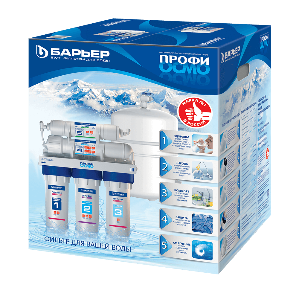 «Профи Осмо 100» от фирмы «Барьер» – это прекрасное решение при поиске фильтра для воды под мойку с обратным осмосом. Бюджетная модель отличается 5 уровнями обработки, разборными колбами и значительным ресурсом активной работы.