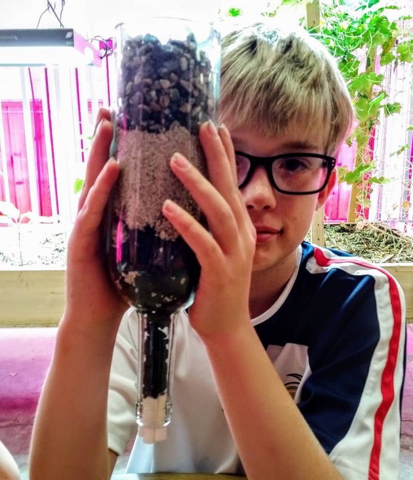- Отрежьте у бутылки донышко. Переверните ее и установите в аккуратно проделанную дырку. Внутрь поместите фильтрационный материал: салфетки с ватой;