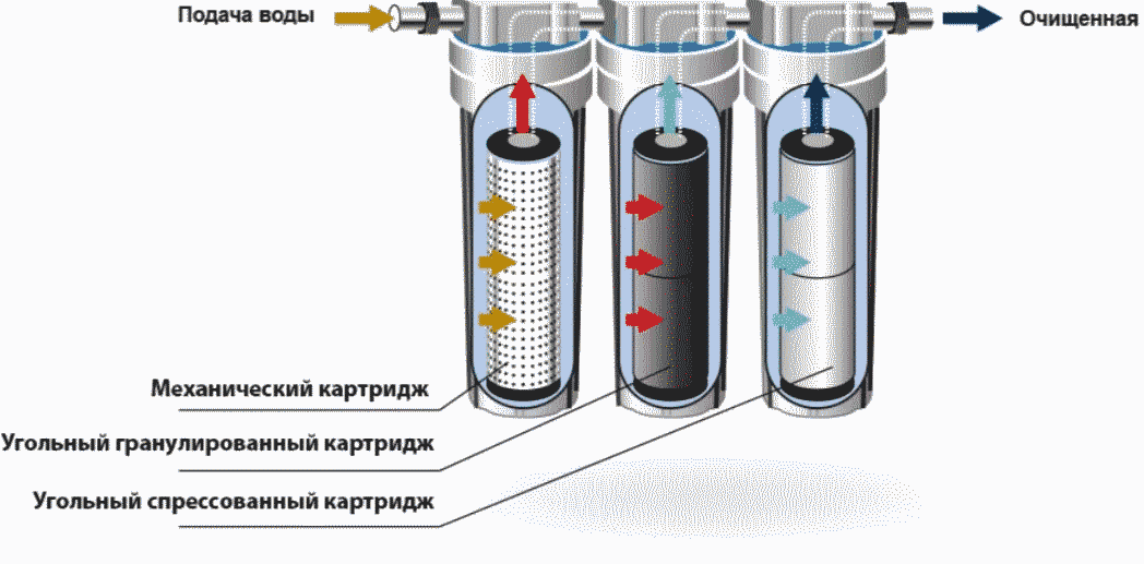 Обычно в комплекс входит три фильтра («питьевая тройка»), каждый из которых выполняет свою часть задачи. Первая ступень удаляет из воды крупные механические частицы, вторая — борется с избыточным хлором, тяжёлыми металлами и органикой, а третья — доочищает и устраняет неприятные запахи.