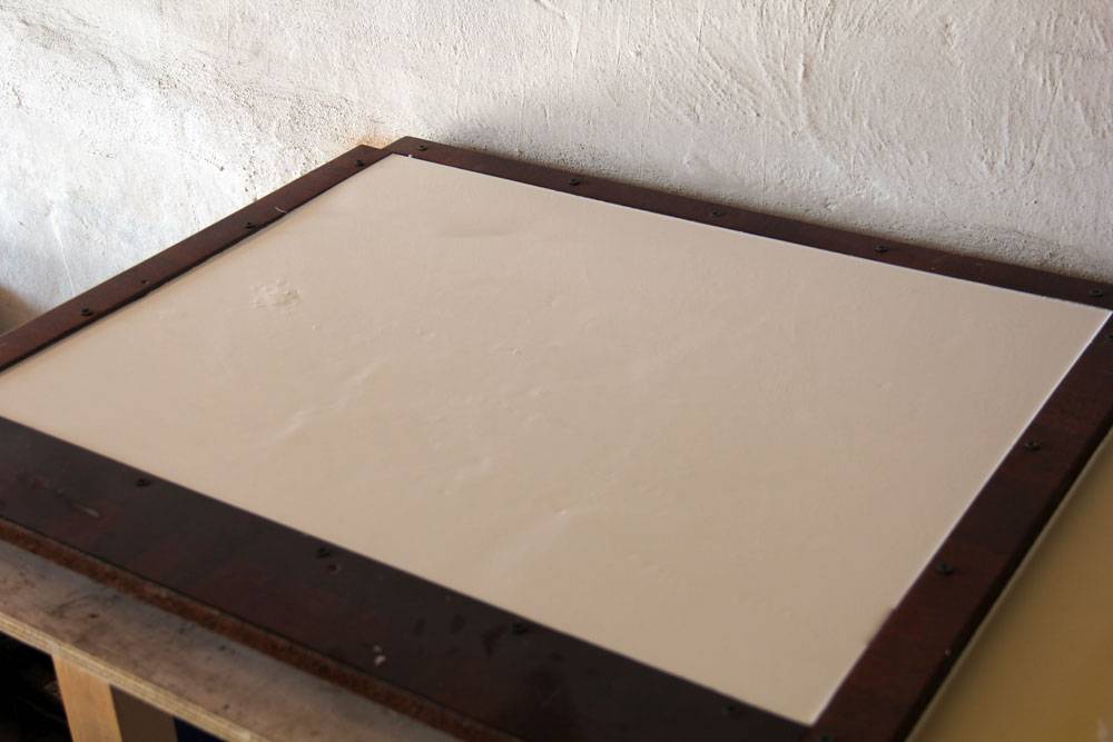 Вторая рамка помещается в первую так, чтобы сделать равномерный зазор. В этот зазор заливают пластик в расплавленном виде. При использовании полиуретана обязательно нужно позаботиться о средствах индивидуальной защиты и вентиляции помещения. Если создается плитка со сложным узором, то используют точную модель, помещаемую в короб.