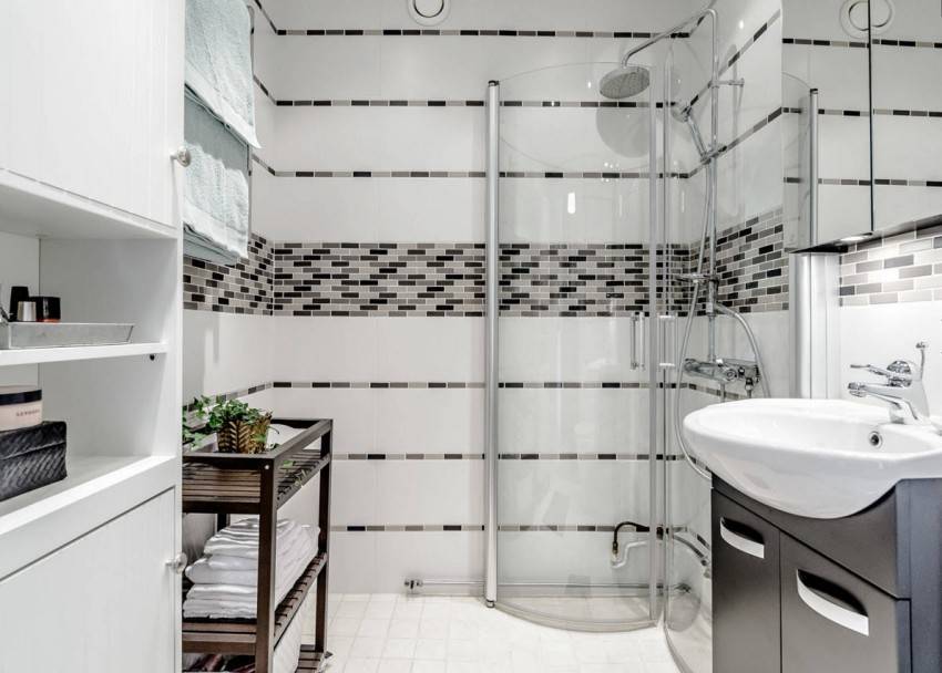 В этом случае очень красиво смотрится плитка, которая произведена в одном стиле, но укладывается на стену фрагментами. Так один из них может быть мозаичным, а второй может иметь крупные размеры в виде горизонтально уложенных плит. При помощи такого способа удается красиво зонировать помещение. К примеру, выделить точку расположения унитаза или гидробокса.