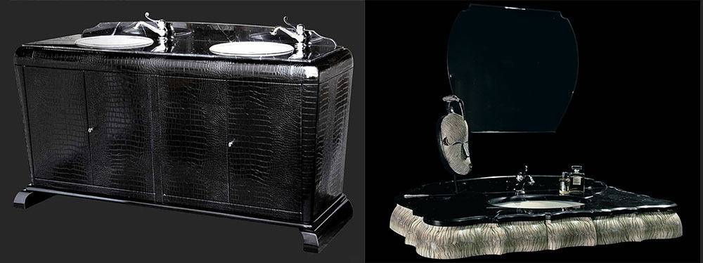 - Еще одна интересная идея ванной 2018 года, которую мы в основном видим в каталогах Bianchini & Caponi, — это возрождение мебели в стиле ар-деко. Такие комплекты преобразят Вашу ванную в поистине королевскую! Однако такой вариант целесообразнее использовать для просторной ванной.