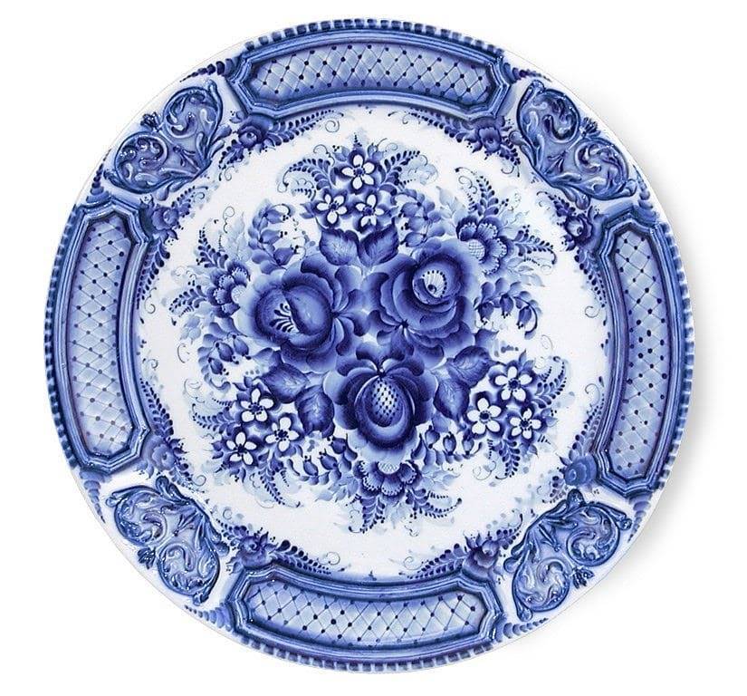 Не стоит забывать и про народное мастерство – гжель, которая очень хорошо смотрится на керамических тарелочках. Чтобы сделать такую роспись, достаточно перевести через копирку понравившийся узор (наметить линии) или перерисовать его от руки.