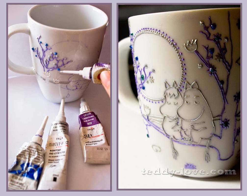 Кружка, как правило, небольшого размера и имеет округлые формы, что надо учитывать при выборе рисунка. На чашечке можно изображать фрукты, животных, сюжеты, а также округлые узоры и орнаменты в виде каймы.
