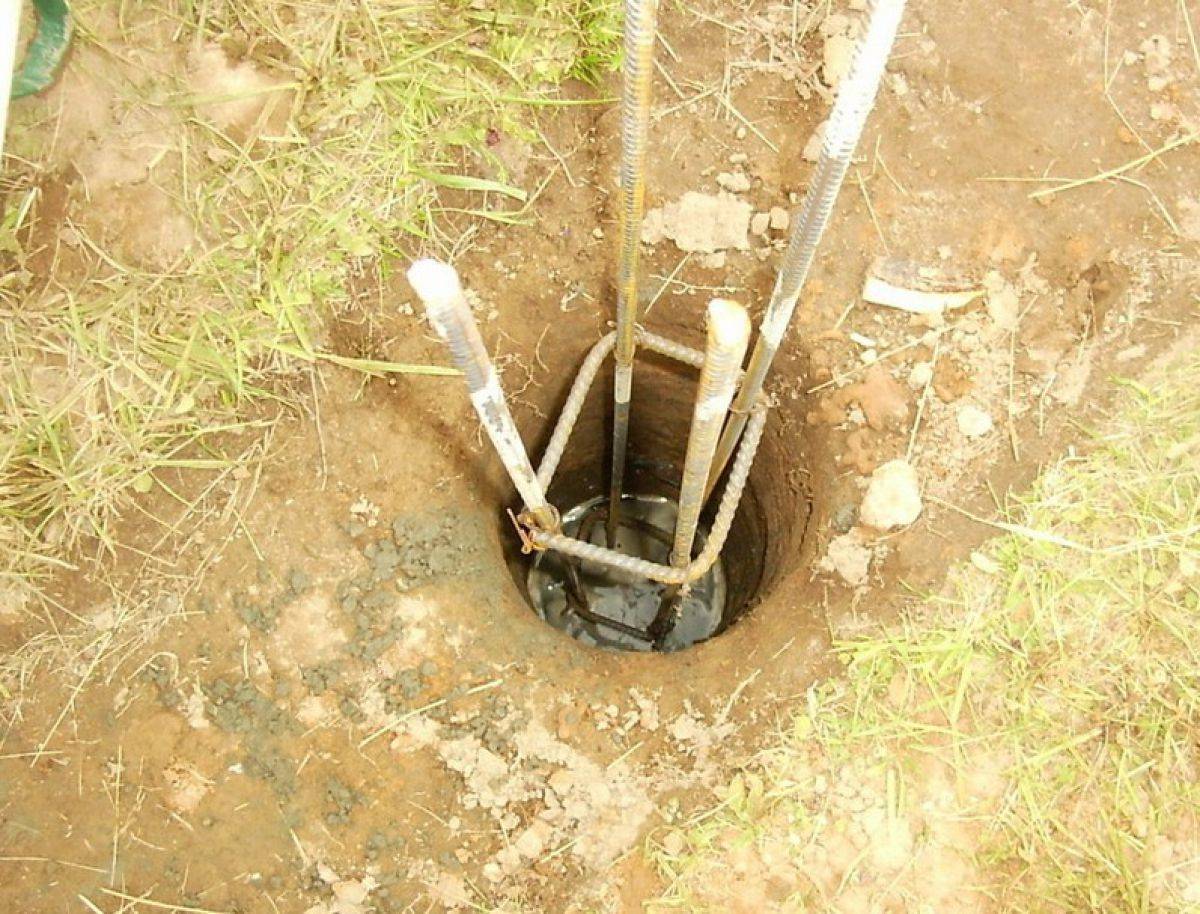 Бетонирование. Процесс затруднен малым диаметром опалубки и торчащими прутками каркаса. Используют подвижную бетонную смесь с заполнением скважины частями и уплотнением с помощью наконечника глубинного вибратора. После заливки до нужного уровня еще раз уплотняют вибратором и/или штыкуют арматурным стержнем.