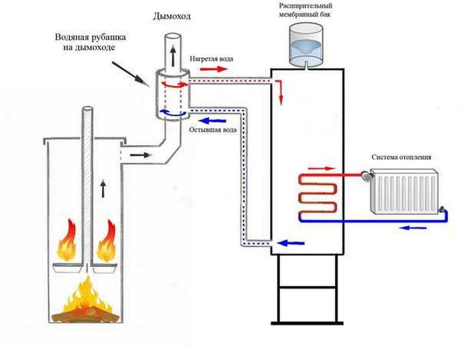 Принцип работы такой системы отопления известен многим сельским жителям. Внутри печи в зоне, близкой к горящему топливу, монтируется сваренный из толстостенных металлических труб коллектор, в котором происходит нагревание воды. По закону физики горячая вода поднимается наверх, по специально оборудованной трубе. Далее она попадает в трубопровод отопления, который расположен с небольшим уклоном, который сохраняется на всем его протяжении. По тем же физическим законам жидкость течет вниз, проходит по всей системе, отдает тепло, в конце концов, попадая обратно в коллектор внутри печи, где круг возобновляется.