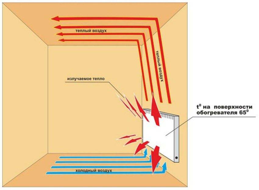 Горячий воздушный поток, выходя из устройства, перемещается вверх, тем самым вытесняя холодную атмосферу вниз. Последняя, контактируя с теплообменником, нагревается и преобразуется в восходящие горячие потоки. Таким образом цикл повторяется – в результате чего температура в помещении быстро возрастает до нужного значения. Если прибор оснащен вентилятором, перераспределением воздушных масс будет ускорено, и температура воздуха в комнате дойдет до заданного уровня быстрее.
