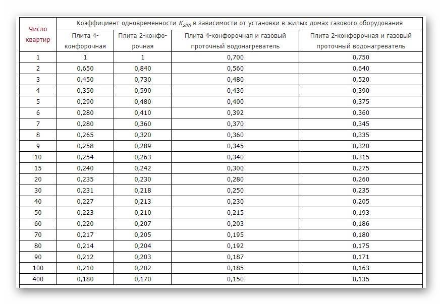 В обязательном порядке понадобится коэффициент одновременности. Он учитывает возможность совместной работы всех потребителей газа, подключенных к сети. Например, всего отопительного оборудования, расположенного в многоквартирном или же частном доме.