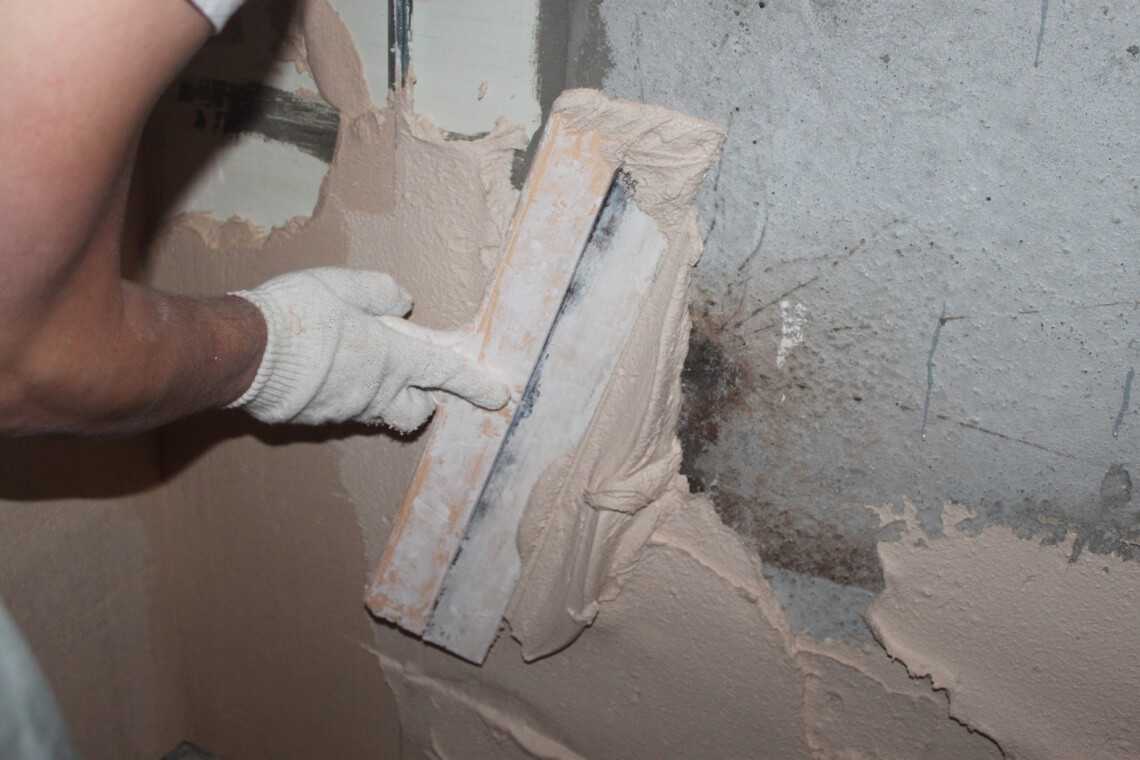 - С бетонной стены удаляют жирные пятна (обезжиривают), снимают наплыв (зубилом, молотком).