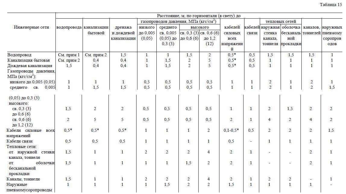 Если нет возможности избежать прокладки коммуникаций под проезжей частью, важно использовать трубы с применением металлического кожуха; от цоколя дома до коммуникаций – не меньше 4 м; дистанция от водяной и канализационной трубы к линии электропередач не менее 1 м; между системами водоснабжения и водоотвода и кабелями связи, силовыми кабелями допустимой нормой считается промежуток 0,5 м; от деревьев к водоснабжению нужно соблюдать промежуток в 2 м, к канализации – 1,5 м; расстояние между водопроводом и канализацией не меньше 0,4 м при параллельном расположении линий. При пересечении, специалисты рекомендуют водопровод располагать на 0,4 м выше канализации. Угол пересечения – 90о, острый угол запрещен; если использовались полимерные водопроводные трубы, в местах пересечения необходима дополнительная защита