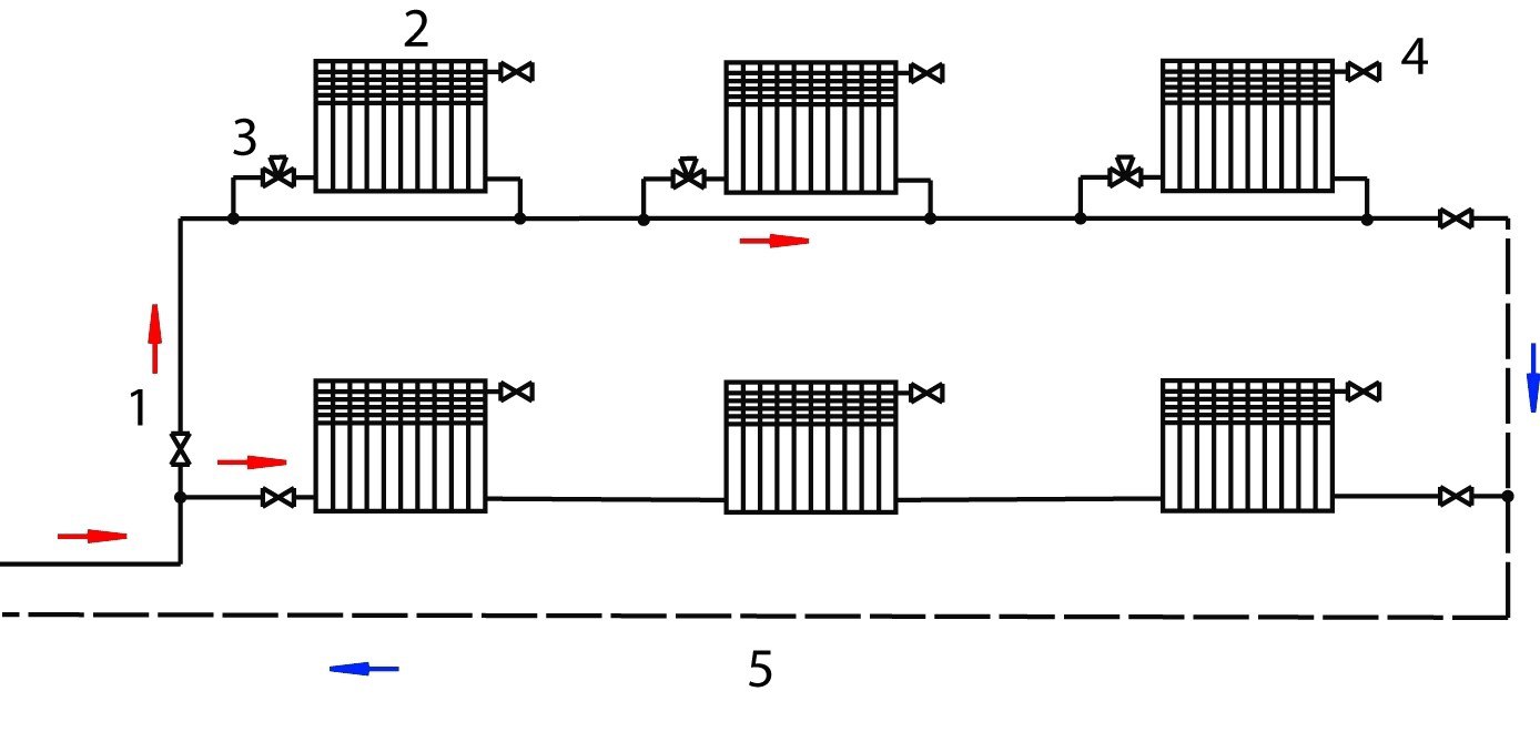 Если теплоноситель из подающего трубопровода, пройдя радиатор, продолжает по обратке движение в том же направлении — это попутная двухтрубная система. Если после приборов отопления направление меняется — тупиковая.