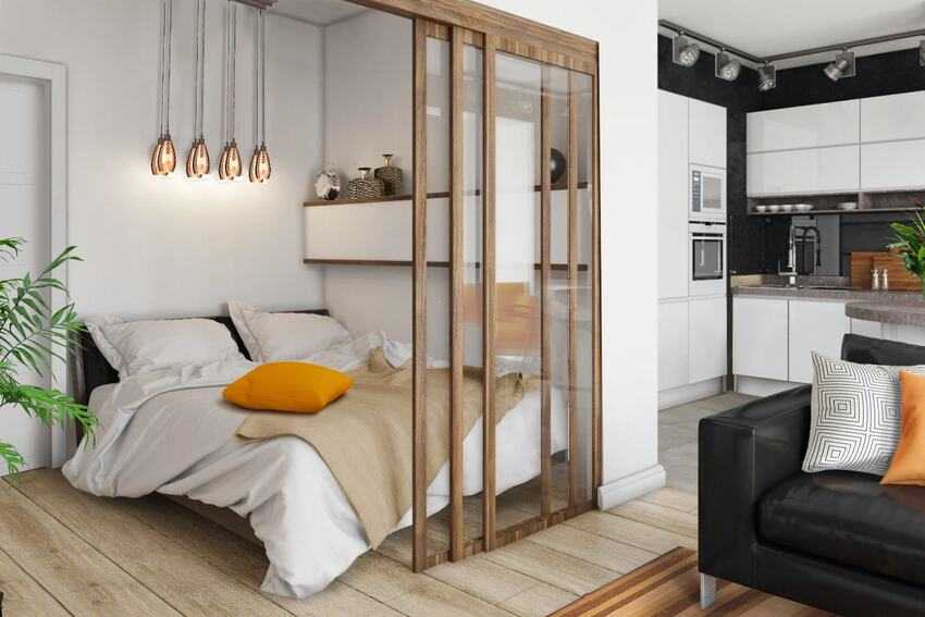 Каждый из типов межкомнатных перегородок имеет свои плюсы и минусы, но в целом все они позволяют совмещать гостиную и спальню с эффектом раздельных помещений.