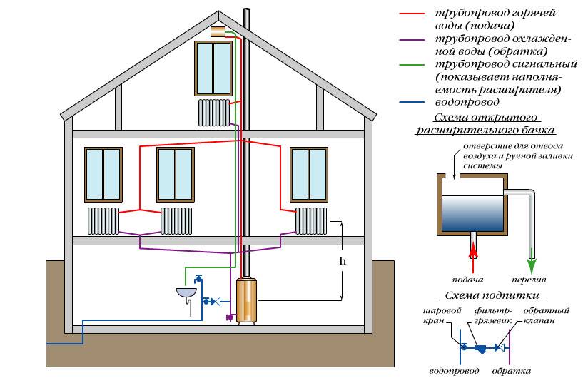 Система отопления открытого типа отличается от предыдущего типа только конструкцией расширительного бака. Данная схема чаще всего использовалась в старых зданиях. Преимуществами открытой системы является возможность самостоятельного изготовления емкости из подручных материалов. Бачок, обычно имеет скромные габариты и устанавливается на кровле или под потолком жилой комнаты.