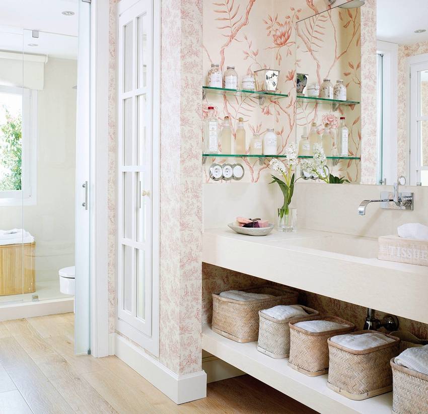 Системы хранения подбираются с учетом габаритов и планировки помещения, и должны соответствовать общей стилистике интерьера. Для оформления небольшого помещения лучше отдавать предпочтение открытым полкам, которые не будут загромождать общее пространство. Они должны быть оснащены защитными бортиками, что исключает вероятность случайного падения косметических средств, емкостей и предметов личной гигиены.