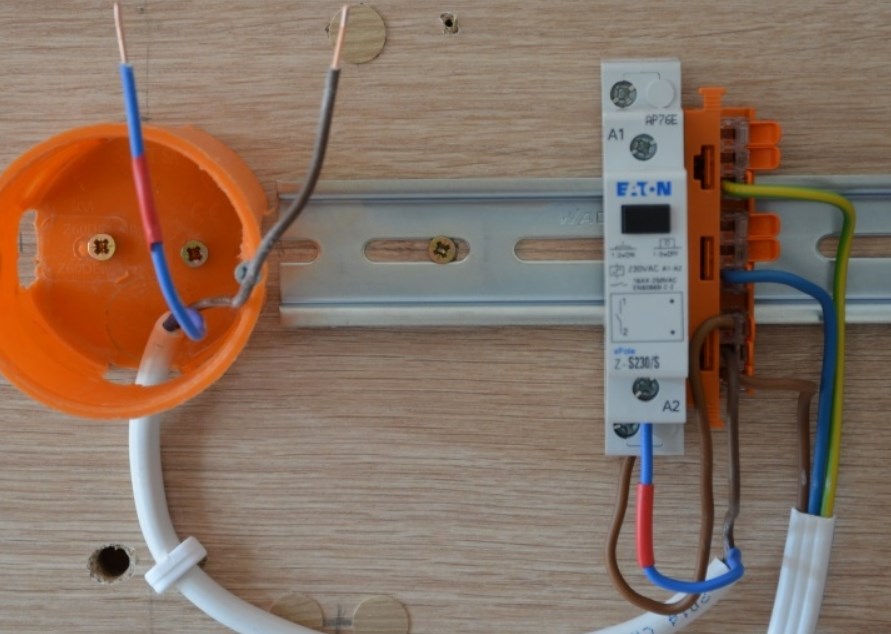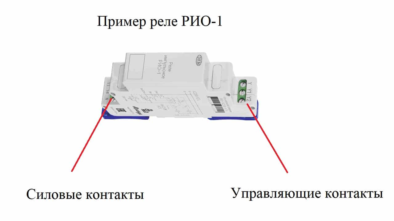 При подсоединении реле, применяемом для управления освещением, вся проводка ведется кабелями одинакового диаметра, поскольку через осветительные приборы идет ток нагрузки проходя по всей цепи выключателей. РИО-1 монтируется в электрощите на рейке DIN, иногда устанавливают просто на гладкий участок стены.