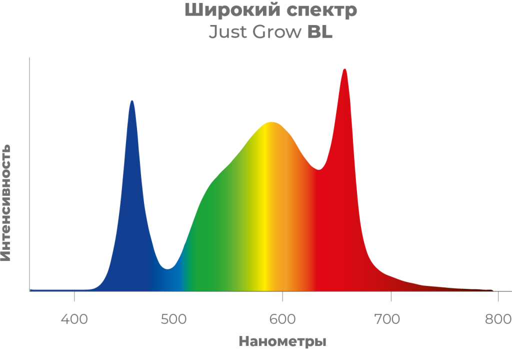 Спектр BL (применяется в светильниках компании Just Grow) — это обогащённый широкополосный спектр, оптимизированный для фотосинтеза в любых условиях. Этот обогащённый широкий спектр разработан, чтобы взять самые важные части ДНаТ, металлогалогенных и узкополосных светодиодных ламп и создать спектральную смесь, которая универсальна для любого применения при выращивании растений.