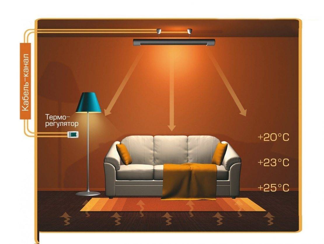 Инфракрасное излучение ламп нагревает не воздух в помещении, а расположенные в нем предметы, которые затем отдают тепло в окружающее пространство. Нагрев происходит за счет невидимых лучей в инфракрасном спектре.