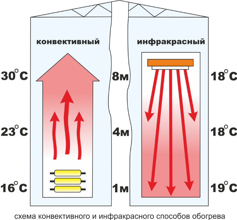 Инженеры рекомендуют устанавливать приборы этого типа для обогрева больших помещений (фабричные помещения, закрытые спортивные площадки, торговые помещения и так далее).