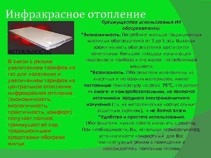 Поэтому, чтобы инфракрасное отопление давало нам только плюсы от его использования, перед покупкой нелишним будет изучить инструкцию