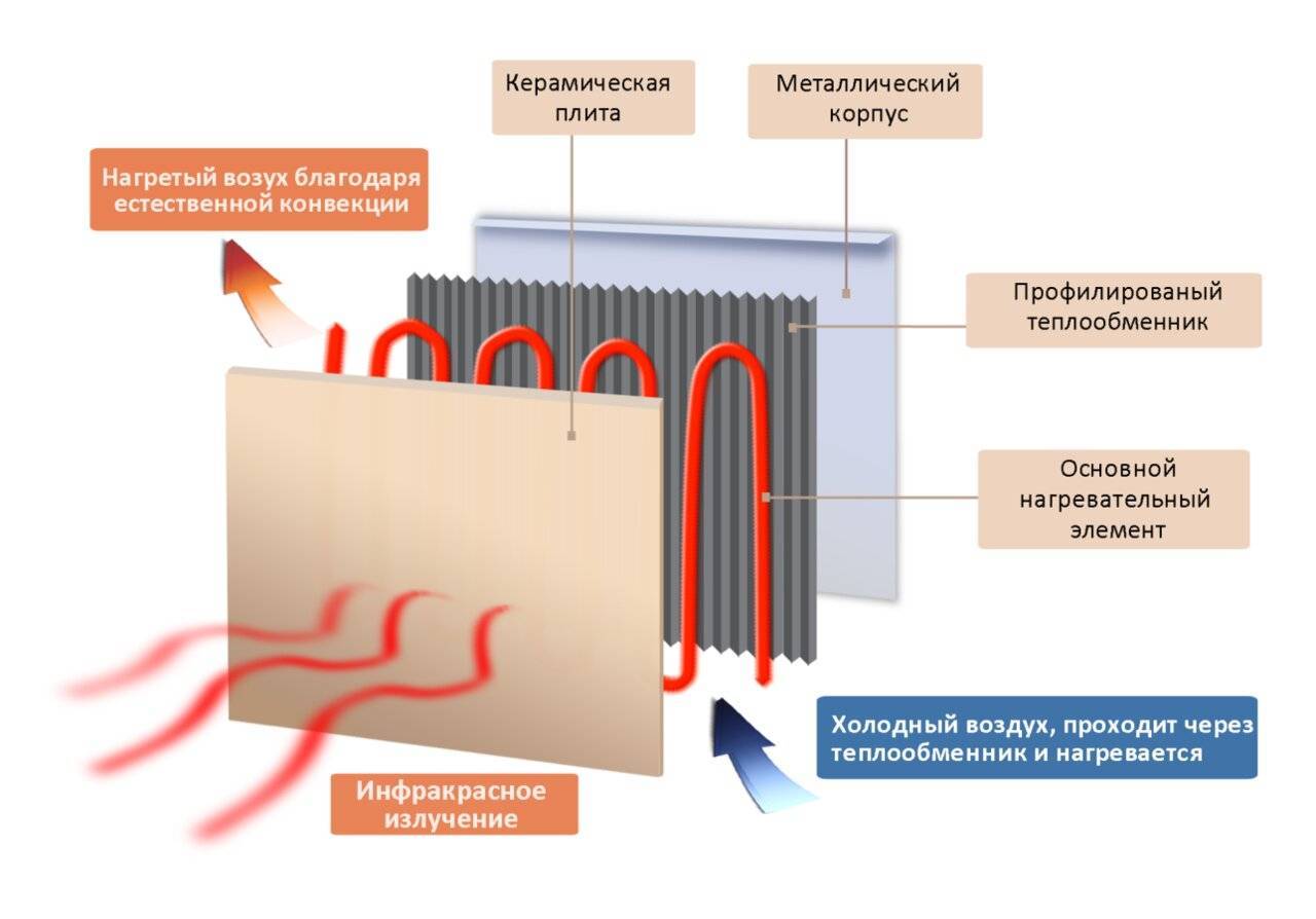 Когда электроэнергия проходит по резисторам, они нагреваются и передают тепло на поверхность с высокой проводимостью тепла. Она затем передает полученную и преобразованную тепловую энергию в инфракрасные волны длиной от 9 до 12 мкм. Эти лучи нагревают другую поверхность, которая обогревает помещение.
