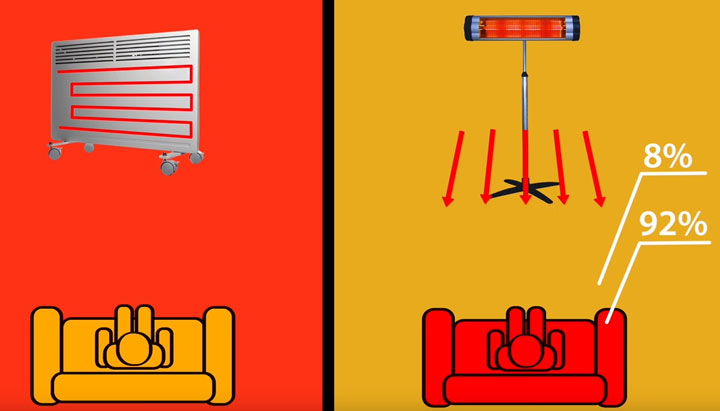 Обычные обогреватели преобразуют энергию в тепло, которое передается окружающему воздуху – проще говоря, греют воздух вокруг себя. Инфракрасный прибор обеспечивает прогрев помещения за счет того, что излучение поглощается конструкциями и предметами, которые нагреваются и отражают тепло в окружающий воздух. В результате площадь теплоотдачи становится больше, а эффективность обогрева – выше при тех же затратах энергии. Одно из главных преимуществ такого подхода – долгое сохранение тепла в помещении после выключения обогревателя.