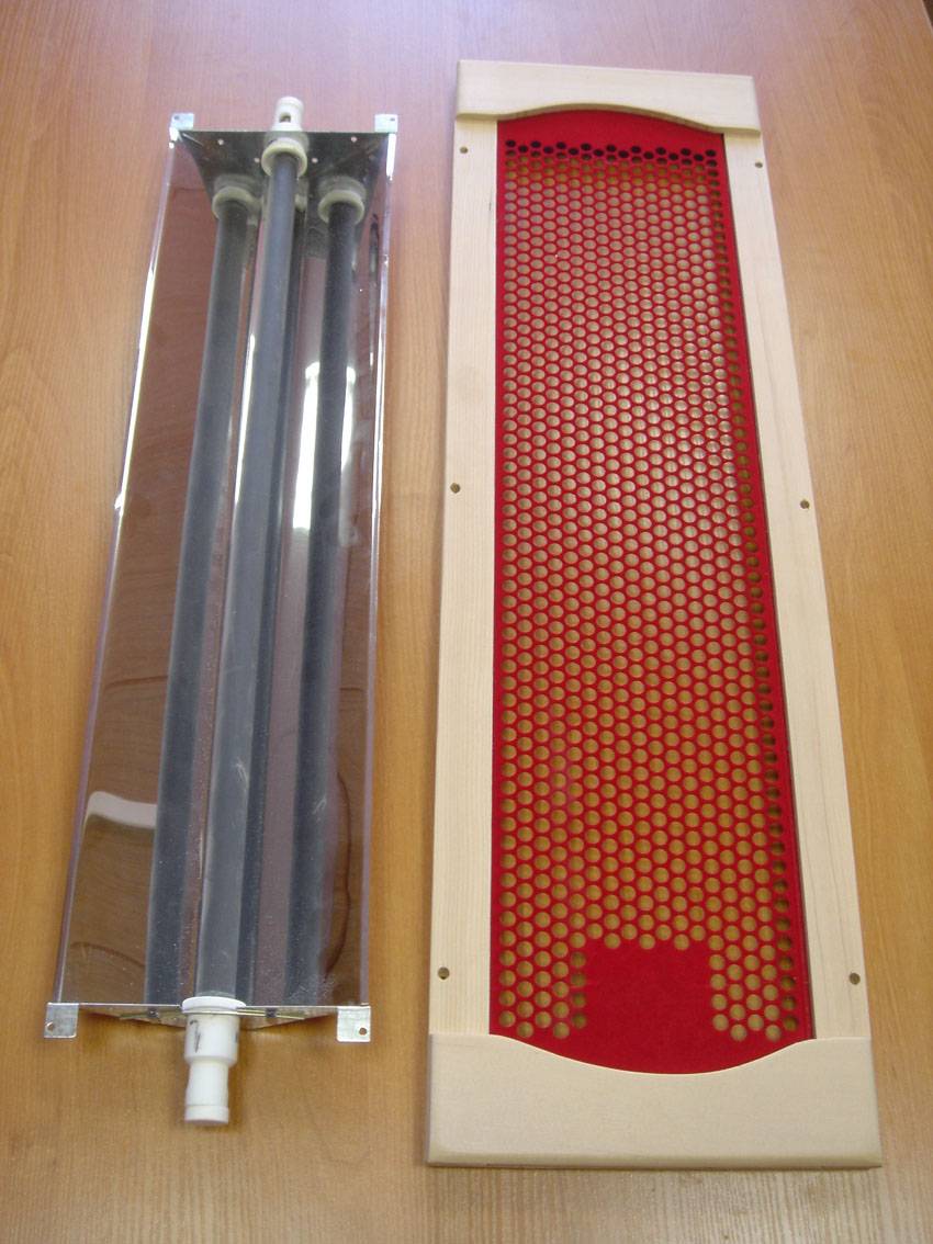 Внешне инфракрасная сауна почти ничем не отличается от термической парной. Разница заключается только в том, что нагревательным элементом здесь служит ИК-обогреватель. Состоит он из следующих элементов: