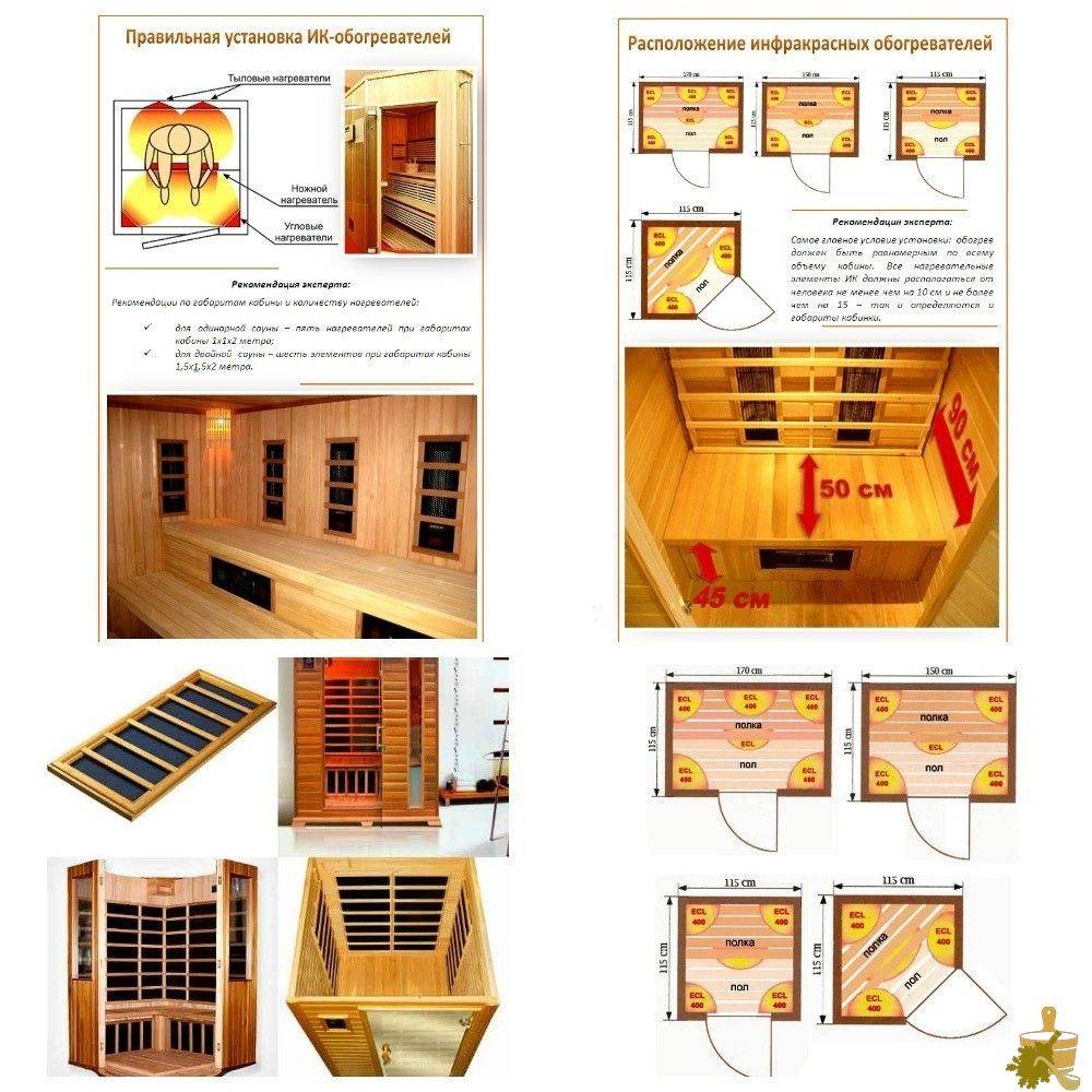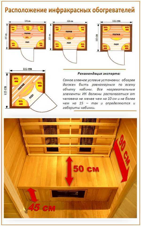 ИК-приборы необходимо разместить так, чтобы создать единое тепловое поле с равномерным прогреванием посетителей сауны. Оборудование лучше всего монтировать вертикально. Это дает возможность максимально воздействовать на тела сидящих людей. Идеальная зона для монтажа составляет около 15–20 см от фигуры человека. Именно это расстояние способно благотворно воздействовать на человеческий организм, в то же время не обжигать кожные покровы.