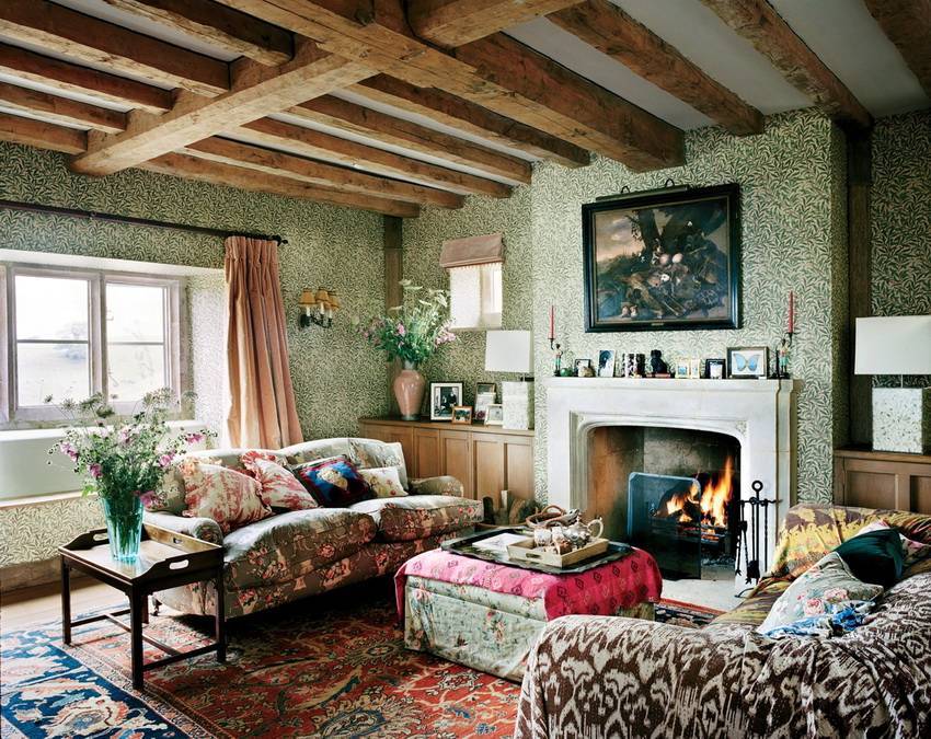 Часто в декорировании комнат коттеджа используют природные материалы и ткани