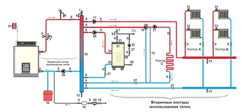 - Подвод системы ГВС. В системе отопления с твердотопливным котлом бойлер удобнее всего разместить непосредственно в котельной. Но тогда для подачи нагретой воды в помещения понадобиться отдельный насос и устройства управления к нему;
