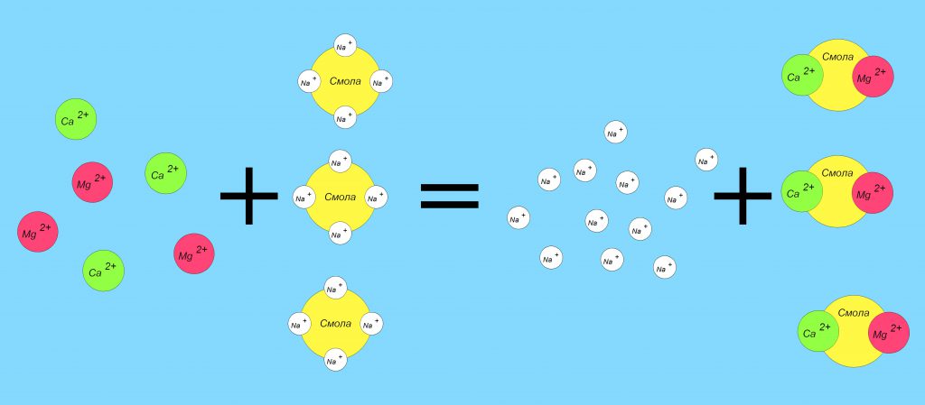 Когда вода проходит через слой смолы, происходит ионный обмен: ионы натрия переходят с поверхности смолы в воду, а ионы кальция и магния осаждаются на смоле. Фактически количество солей в воде не меняется: соли жесткости заменяются “безопасной” поваренной солью, которая не дает накипи и не мешает работе моющих средств.