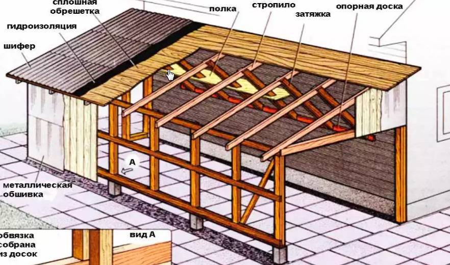 На лицевой и торцевой частях крыши вам необходимо будет смонтировать небольшие козырьки, служащие для защиты стен гаража от потоков дождевой воды. Подобные козырьки вы можете изготовить из обрезной доски толщиной 50 мм, пробитой по обрезу другой доской. Крепятся они под верхним тавром балки.