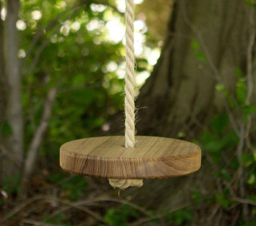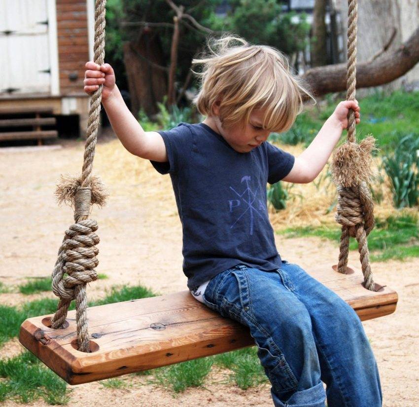 Простые детские качели, изготовленные с использованием деревянной доски и каната