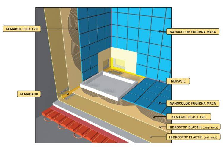 Если стены неровные, на таких участках рекомендуется использовать многослойную прокладку. Первый слой может быть из битумного праймера, второй — гидроизоляция, далее тонким слоем наносится кварцевый песок, на него плиточный клей и в завершение — плитка. Чем больше деформация стены, тем толще должен быть слой клея.