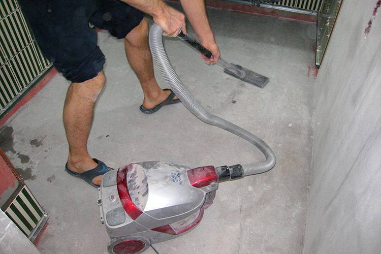 Первый этап работ посвящается подготовке основания. Если стяжка новая, с нее достаточно смести мусор/пыль. В противном случае нужно снять напольное покрытие, очистить поверхность с помощью веника (пылесоса). После этого поверхность осматривается, выявляются все проблемные участки (жирные пятна, остатки краски, отслоения бетона, другие дефекты).