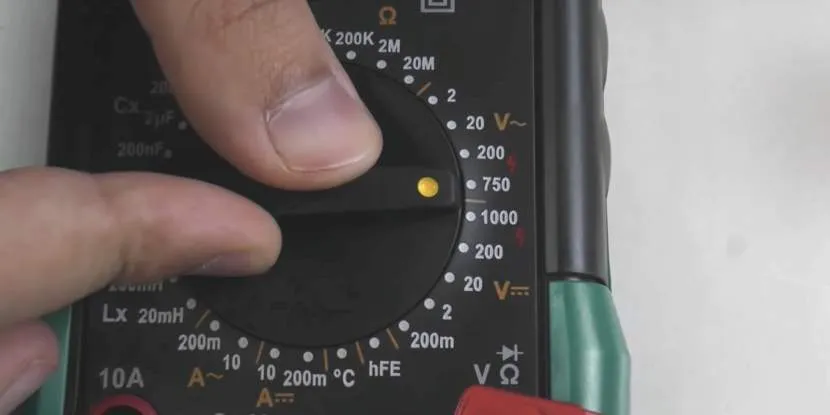 После установки щупов переведите переключатель мультиметра на подходящий диапазон. Если измеряется напряжение в розетке, выбирайте пороговое значение в 750 ACV, если, к примеру, автомобильного аккумулятора — 20 или 200 DCV.