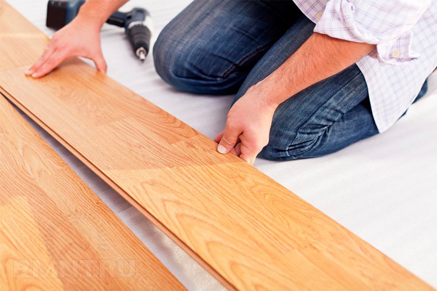 Укладку ламината завершают монтажом плинтуса, который обязательно крепится к стене и не прижимает ламинат жёстко.