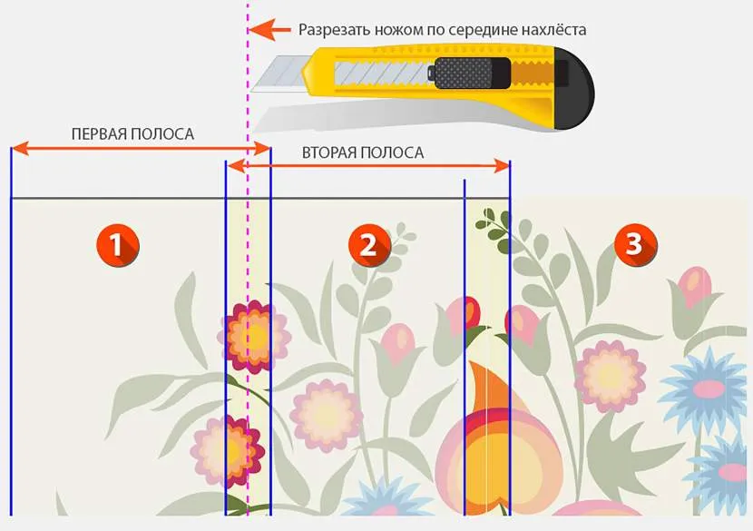 С обеих сторон должен быть запас. Чтобы подогнать рисунок в случае перекоса, следующая полоса накладывается внахлест до совмещения узора с отступом от края 5–10 сантиметров. При помощи линейки, которая служит упором, наложенные полотна прорезаются точно по рисунку. Если требуется, то стыкуемые участки дополнительно промазываются составом.. Стыковка наружного угла с подрезкой на одной из смежных плоскостей считается наиболее эффективным способом обустройства