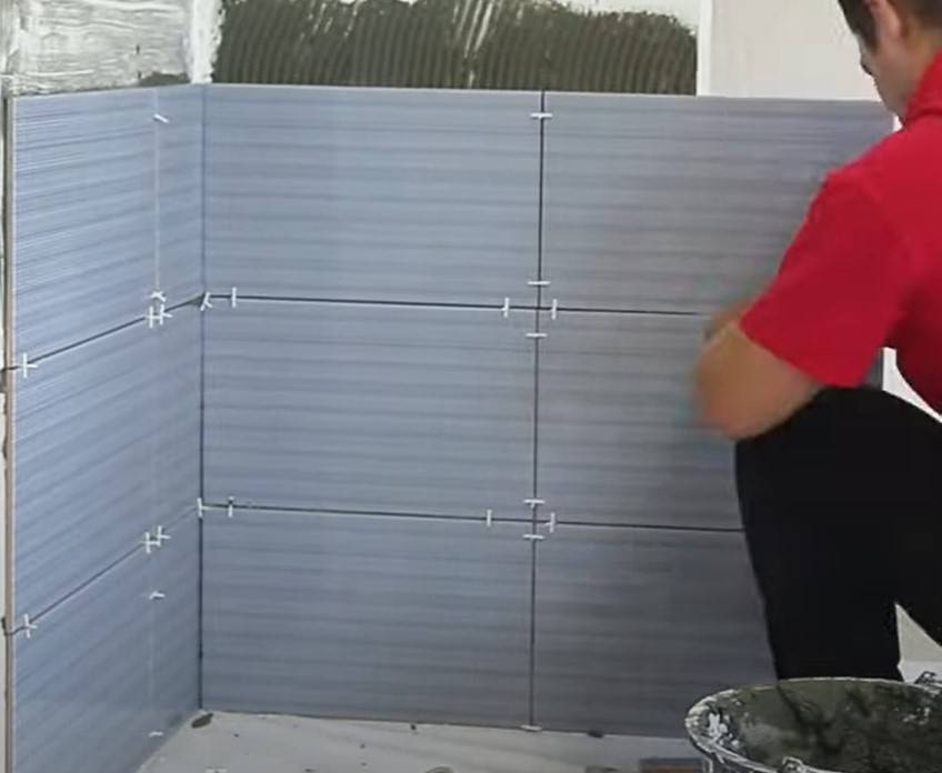 - Между уложенными соседними элементами вставляются пластиковые фиксаторы толщины шва – «крестики», которые можно приобрести в любом строительном магазине. «Крестики» фиксируют положение элемента на стене во всех направлениях.