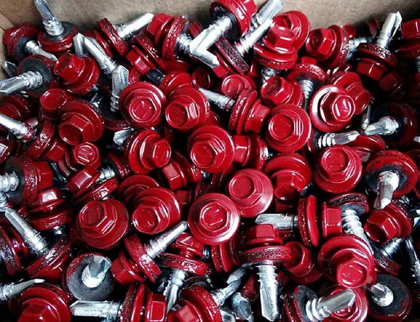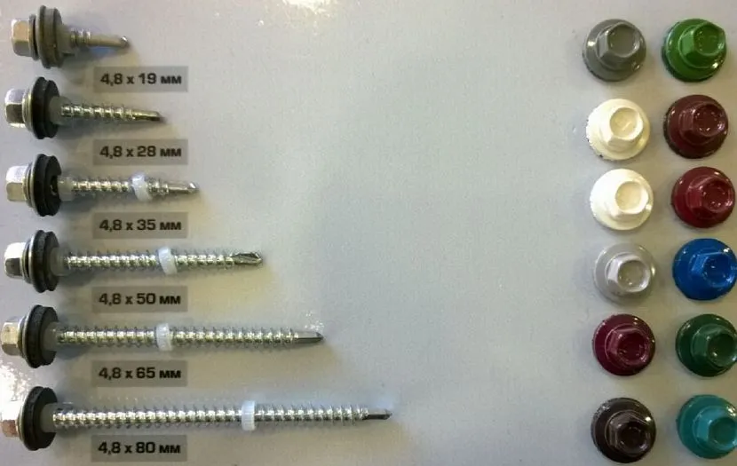 Крепежи состоят из шляпки и сверла, между ними располагается резиновая прокладка. Нижний острый конец ввинчивают в отверстие в профнастиле. Головки саморезов покрывают тонким полимерным слоем. Защита оберегает металл от негативного воздействия улицы. Если крепления подобрать в тон листа, то элементы не видны на поверхности.