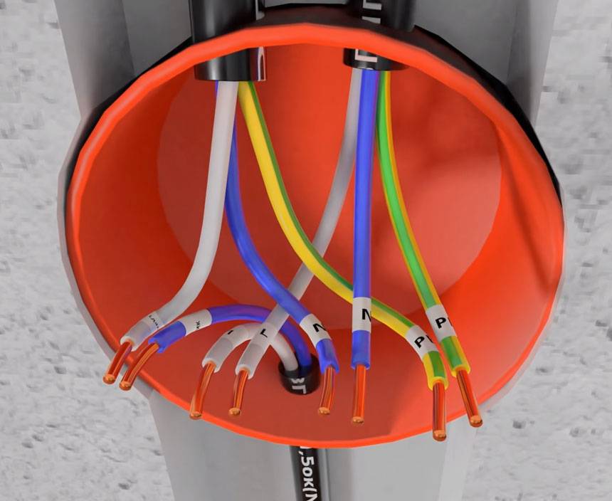 Далее, кабель идущий на светильник, также заводим в распредкоробку. Внутри нее соединяем все жилы в следующей последовательности.