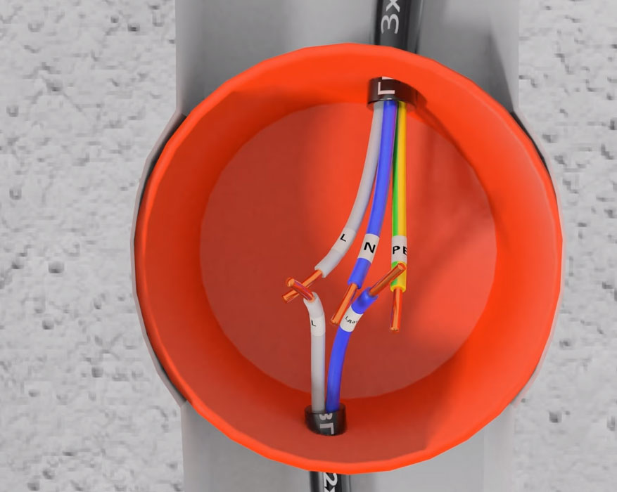 Рассмотрим процесс монтажа с самого начала. Первым делом заводите трехжильный кабель ВВГнг-Ls 3*1,5мм2 от автомата в щитке в распредкоробку. Обозначаете и маркируете его жилы: фаза, ноль, земля.