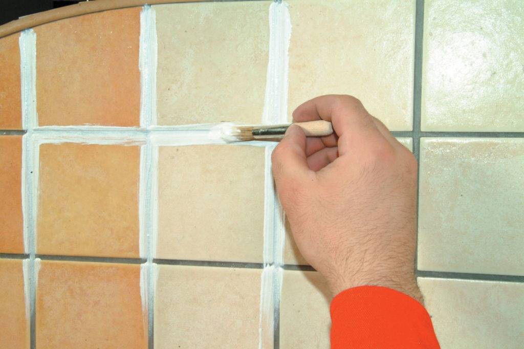 Перед тем как обновить швы между плиткой, необходимо подготовить их под покраску. Для этого пространство между кафелем протирается от пыли. Затем при помощи тонкой кисточки на швы аккуратно наносится краска.